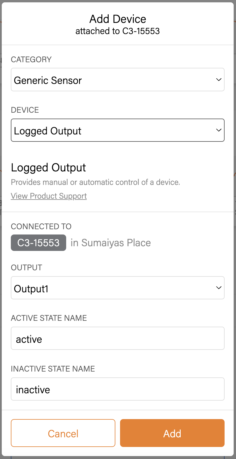 The Logged Output device can be found under the "Generic Devices" category in Manage Equipment. Select the Output that is connected to the electrical device, update the Active and Inactive state names if needed, and click Add.